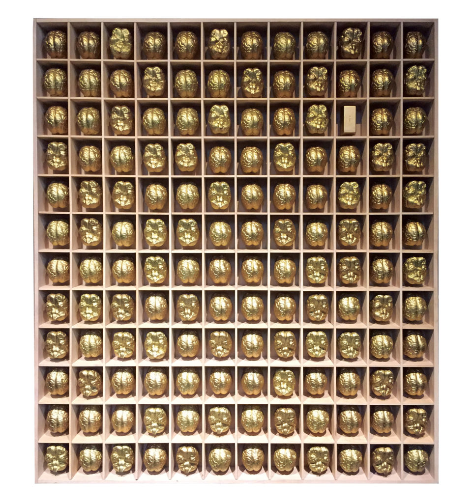 218 x 182 x 18 cm. Wood, resin and gold leaf, 2018.